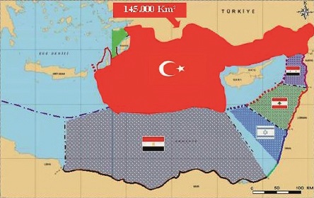 Το δημοσίευμα φιλοξενεί χάρτες όπου η ΑΟΖ της Τουρκίας εκτείνεται στα 145.000 τετραγωνικά χιλιόμετρα, ένας ευσεβής πόθος της γειτονικής χώρας που ουσιαστικά χωρίζει την Ελλάδα από την Κύπρο.