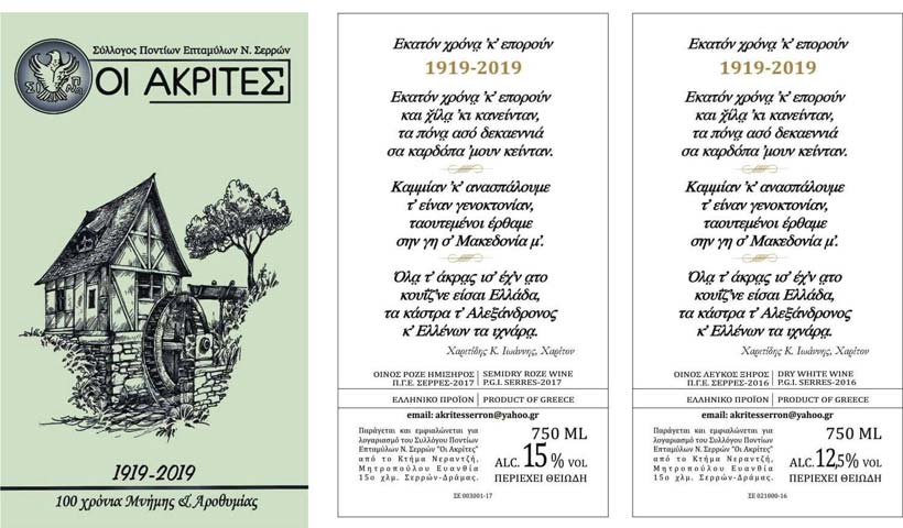 «Οίνος ευφραίνει καρδίαν ανθρώπου» έλεγαν οι αρχαίοι πρόγονοί μας, και ο Σύλλογος Ποντίων Επταμύλων Νομού Σερρών «Οι Ακρίτες» συμφωνεί απολύτως! Αντί του κλασικού ημερολογίου για το 2019, το Διοικητικό του Συμβούλιο αποφάσισε να λανσάρει επετειακά κρασιά, με ιδιαίτερα προσεγμένες ετικέτες και μηνύματα τόσο για τη Γενοκτονία των Ποντίων όσο και για τη Μακεδονία.
