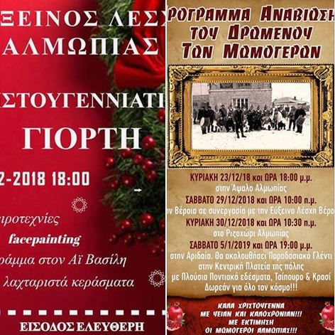 Η Εύξεινος Λέσχη Αλμωπίας γνωστοποίησε το πρόγραμμα των φετινών εορταστικών εκδηλώσεων που διοργανώνει ενόψει των Χριστουγέννων και της Πρωτοχρονιάς. Συγκεκριμένα, θα πραγματοποιηθούν οι παρακάτω εκδηλώσεις:
