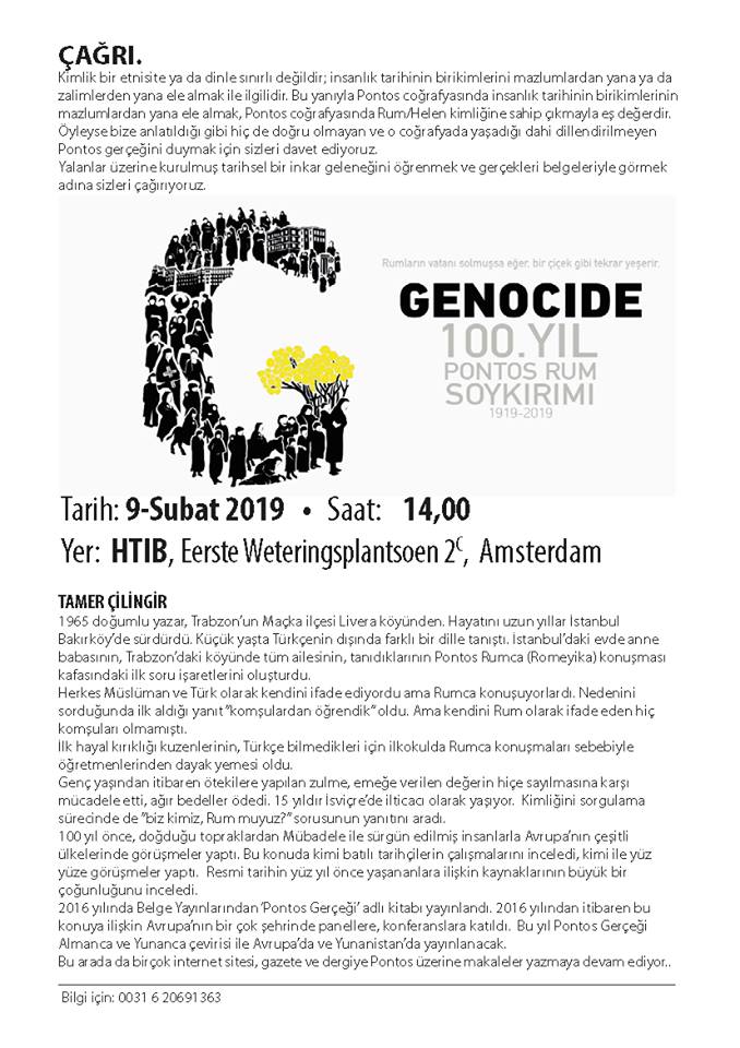 Την αλήθεια για τη Γενοκτονία των Ελλήνων του Πόντου με αποδείξεις και ντοκουμέντα θέτουν τάπητος ειδικοί και μη, το Σάββατο 9 Φεβρουαρίου, στις 14:00, στο Άμστερνταμ της Ολλανδίας.