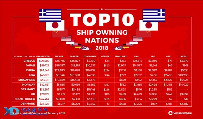 Σύμφωνα με την «Top 10 λίστα ιδιοκτησίας πλοίων» (Top 10 Ship Owning List) των μεγάλων εθνών της ναυτιλίας, η οποία δημοσιεύεται από την εταιρεία VesselsValue του Λονδίνου και βρίσκεται στη διάθεση της γερμανικής εφημερίδας Die Welt, η αξία των πλοίων των Ελλήνων εφοπλιστών ξεπερνά για πρώτη φορά το φράγμα των 100 δισ. δολαρίων. Πρόκειται γενικώς για την πρώτη φορά που μια χώρα διαθέτει τόσο μεγάλης αξίας φορτηγά πλοία. Σε σχέση με την προηγούμενη χρονιά οι ελληνικές ναυτιλιακές εταιρείες αύξησαν για άλλη μια φορά το ποσό της αξίας των πλοίων τους κατά 5,5 δισ. δολάρια (4,8 δισ. ευρώ).