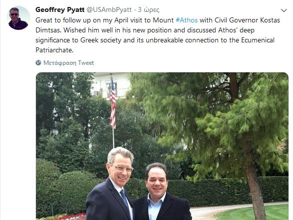 Οι Δήμτσας και Πάιατ συζήτησαν τη βαθιά σημασία του Αγίους Όρους για την ελληνική κοινωνία και την άρρηκτη σύνδεσή του με το Οικουμενικό Πατριαρχείο, όπως κάνει γνωστό με ανάρτησή του στο Twitter ο Αμερικανός πρέσβης. Επίσης, ο Τζ. Πάιατ ευχήθηκε στον Κ. Δήμτσα κάθε καλό για τη νέα του θέση.