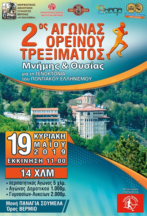 Στον Ιερό Ναό της Παναγίας Σουμελά στην Καστανιά Ημαθίας θα πραγματοποιηθεί και φέτος ο «2ος Αγώνας Δρόμου Ορεινού Τρεξίματος – Μνήμης και Θυσίας του Ποντιακού Ελληνισμού», την Κυριακή 19 Μαΐου. Ο αγώνας αφιερώνεται στη μνήμη των 353.000 νεκρών και διεξάγεται μια συμβολική ημέρα για τους απανταχού Ποντίους, καθώς συμπληρώνονται 100 χρόνια από τη Γενοκτονία που βίωσαν οι πρόγονοί τους. Ο αγώνας συνδιοργανώνεται από τον Μορφωτικό-Αθλητικό Σύλλογο Βέροιας «Η Καλλιθέα», το Δήμο Βέροιας, το Κέντρο Κοινωνικής Προστασίας, Αλληλεγγύης, Αθλητισμού, Παιδείας και Προσχολικής Αγωγής Δήμου Βέροιας και την τεχνική υποστήριξη του Συλλόγου Δρομέων Βέροιας, και τελεί υπό την αιγίδα της Μητρόπολης Βεροίας, Ναούσης και Καμπανίας και του Σωματείου «Παναγία Σουμελά».