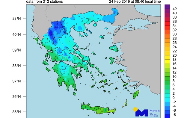 Πολύ χαμηλές θερμοκρασίες, που άγγιξαν και τους -8 βαθμούς Κελσίου στη δυτική Μακεδονία, έφερε στο πέρασμά της η κακοκαιρία «Ωκεανίς» και καταγράφηκαν σήμερα το πρωί. Ο χάρτης που ακολουθεί παρακάτω δίνει την κατανομή της θερμοκρασίας στη χώρα, όπως προκύπτει από ανάλυση μετρήσεων 312 σταθμών του δικτύου αυτόματων μετεωρολογικών σταθμών του Εθνικού Αστεροσκοπείου/meteo.gr στις 9 το πρωί της Κυριακής 24 Φεβρουαρίου 2019