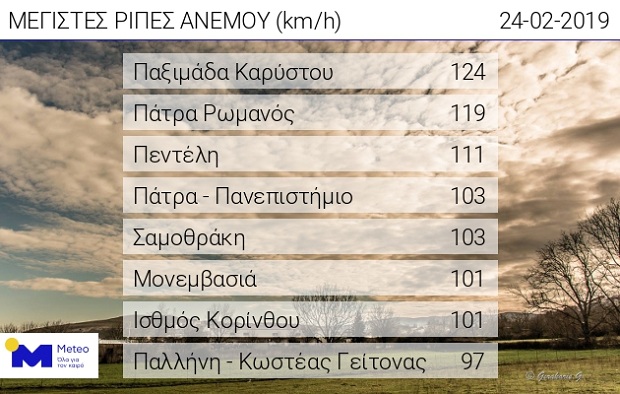 Ταυτόχρονα παραμένουν πολύ θυελλώδεις οι άνεμοι στο Αιγαίο καθώς και κατά μήκος του Κορινθιακού Κόλπου.