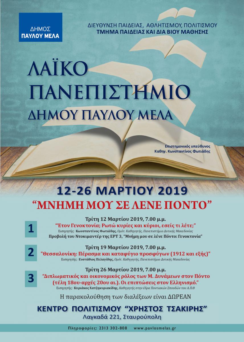 Στο πλαίσιο των δράσεων για τα 100 χρόνια από τη Γενοκτονία των Ποντίων το Τμήμα Παιδείας και Διά Βίου Μάθησης αφιερώνει τον νέο κύκλο μαθημάτων του Λαϊκού Πανεπιστημίου Δήμου Παύλου Μελά, με τίτλο «Μνήμη μου σε λένε Πόντο», στην ιστορία του ποντιακού ελληνισμού.