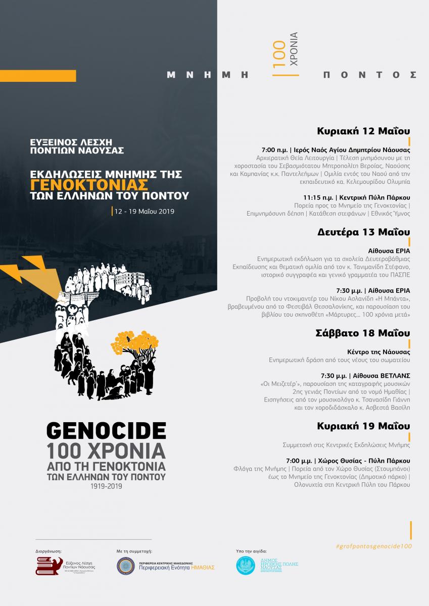 Η Εύξεινος Λέσχη Ποντίων Νάουσας – Εθνική Βιβλιοθήκη Αργυρουπόλεως «Ο Κυριακίδης», ενόψει της ημέρας Μνήμης της Γενοκτονίας του Ποντιακού Ελληνισμού, διοργανώνει εκδηλώσεις μνήμης της Γενοκτονίας των Ελλήνων του Πόντου το μήνα Μάιο, τιμώντας τη μνήμη των 353.000 άταφων νεκρών, θυμάτων των θηριωδιών των Νεότουρκων. Το 2019 φέρει ιδιαίτερη βαρύτητα καθώς συμπληρώνονται 100 χρόνια από την Γενοκτονία των Ποντίων.