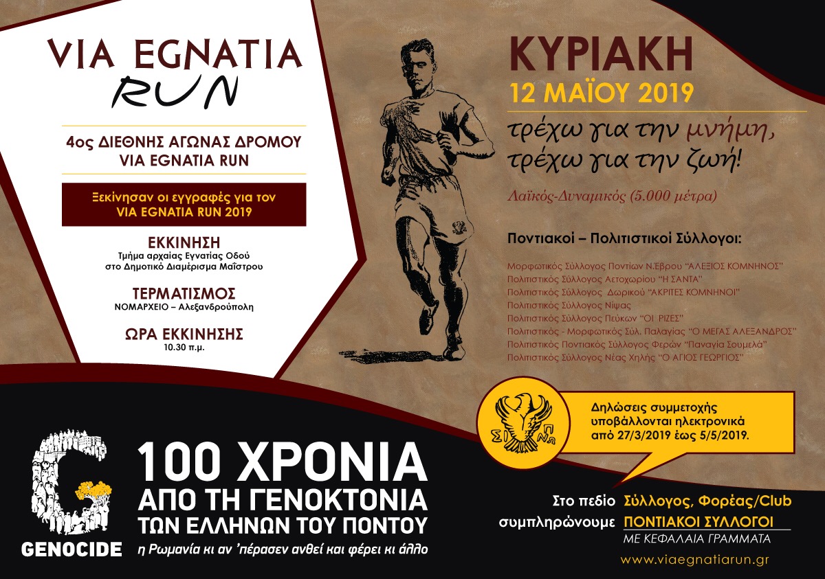 Θέλοντας να στείλουν ένα ισχυρό μήνυμα για τη διεθνοποίηση της Γενοκτονίας των Ποντίων, αλλά και ένα μήνυμα ειρήνης και φιλίας μεταξύ των λαών, μέλη ποντιακών και πολιτιστικών συλλόγων της Αλεξανδρούπολης την ερχόμενη Κυριακή θα βάλουν τα αθλητικά τους παπούτσια και θα βρεθούν στη γραμμή εκκίνησης του 4ου Via Egnatia Run.