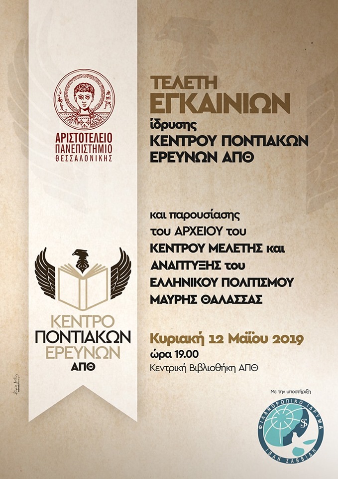 Με δύο σπουδαία γεγονότα συνδέει το ΑΠΘ τη 12η Μαΐου 2019, την τελετή εγκαινίων του Αρχείου του Κέντρου Μελέτης και Ανάπτυξης του Ελληνικού Πολιτισμού Μαύρης Θάλασσας και την ίδρυση του Κέντρου Ποντιακών Ερευνών στο ΑΠΘ που αποτελεί μετεξέλιξη της Έδρας Ποντιακών Σπουδών. Και τα δύο αναμένεται να πραγματοποιηθούν στις 19:00, στο Επιστημονικό Αναγνωστήριο της Κεντρικής Βιβλιοθήκης του ΑΠΘ, μετά τη λήξη του συνεδρίου «Η Γενοκτονία των χριστιανικών πληθυσμών της Οθωμανικής Αυτοκρατορίας και οι συνέπειές της (1908-1923)», της Έδρας Ποντιακών Σπουδών (10-12 Μαΐου στην Αίθουσα Τελετών «Αλέξανδρος Παπαναστασίου» της Παλαιάς Φιλοσοφικής Σχολής).