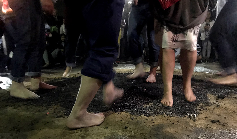 Πριν από το βάδισμα με γυμνά πόδια πάνω σε ένα στρώμα πυρακτωμένων κάρβουνων, γίνεται μια ιδιαίτερη προσευχή στον κλειστό χώρο, το κονάκι, όπου η ατμόσφαιρα είναι φορτισμένη με πνευματικά χαρακτηριστικά. Το τελετουργικό συνοδεύουν οι τρεις μουσικοί με θρακιώτικη λύρα, γκάιντα και νταούλι.