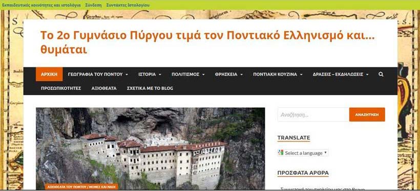 Με σκοπό την ανάδειξη της ιστορίας και του τρόπου ζωής των Ποντίων οι μαθητές του 2ου Γυμνασίου Πύργου, με τη βοήθεια των καθηγητών τους, δημιούργησαν από το μηδέν ένα blog για τον ποντιακό ελληνισμό, κερδίζοντας το 1ο πανελλήνιο βραβείο –στην κατηγορία ιστολόγιο– στον διαγωνισμό «Ποντιακός Ελληνισμός: μνήμες και όνειρα, παρελθόν, παρόν και μέλλον». Ο διαγωνισμός πραγματοποιήθηκε για τρίτη χρονιά με την έγκριση του Υπουργείου Παιδείας, Έρευνας και Θρησκευμάτων, με την υποστήριξη του Πανελλήνιου Συνδέσμου Ποντίων Εκπαιδευτικών και τελούσε υπό την αιγίδα της Ελληνικής Εθνικής Επιτροπής για την UNESCO.
