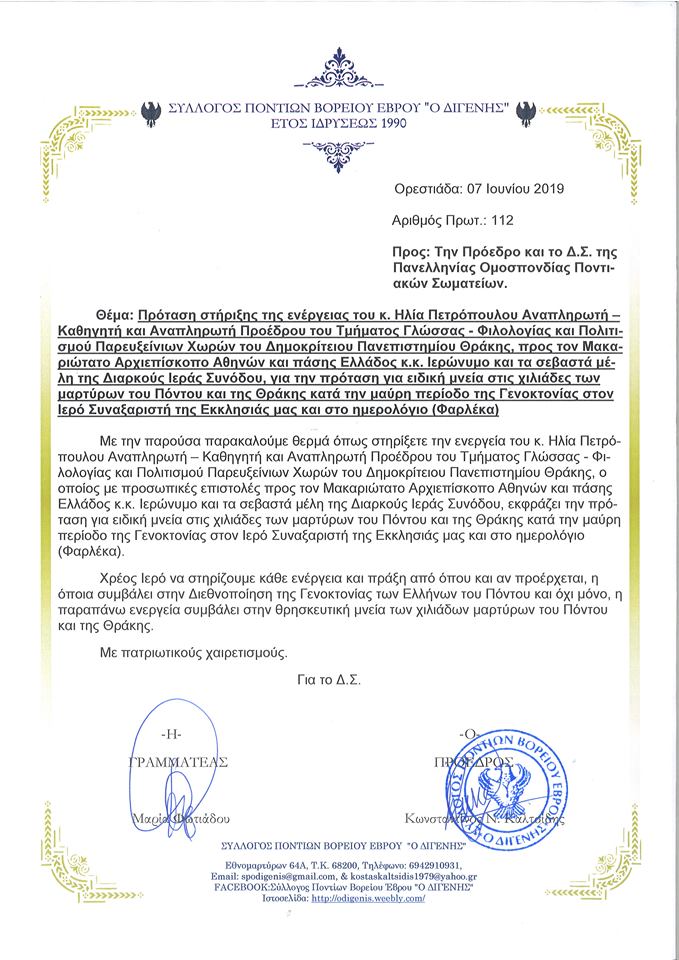 «Χρέος ιερό να στηρίζουμε κάθε ενέργεια και πράξη, απ’ όπου και αν προέρχεται, η οποία συμβάλλει στη διεθνοποίηση της Γενοκτονίας των Ελλήνων του Πόντου και όχι μόνο. Η ενέργεια του καθηγητή συμβάλλει στη θρησκευτική μνεία των χιλιάδων μαρτύρων του Πόντου και της Θράκης» αναφέρει η επιστολή του Συλλόγου.