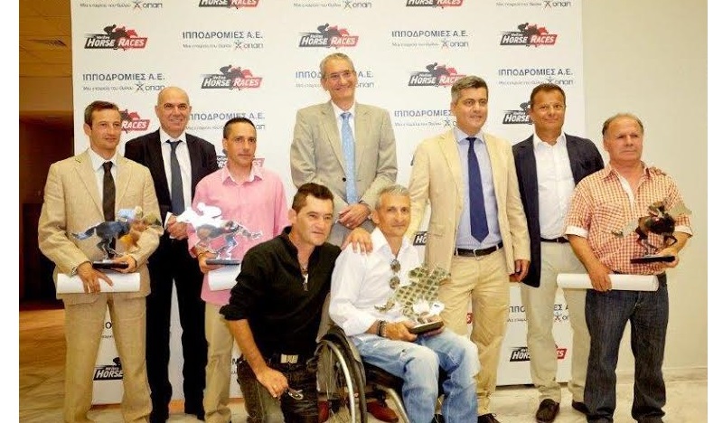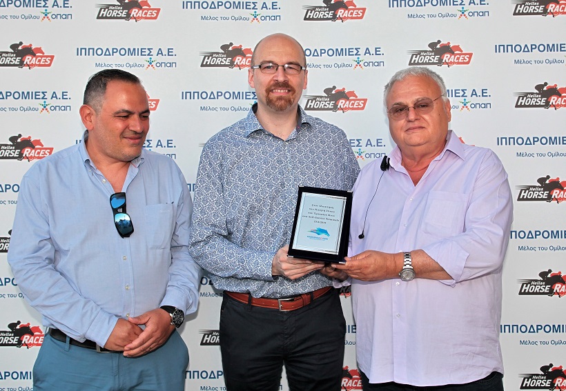 O Chief Technology Officer του ΟΠΑΠ, Michele Fusella και ο Applications Director του ΟΠΑΠ, Στρατής Βαλαβάνης απονέμουν το Τρόπαιο «ΚΙΝΟ ΣΤΑ SELF SERVICE TERMINALS» στον ιδιοκτήτη του ίππου ΣΠΑΡΤΗ Δημήτρη Παρασκευόπουλο.