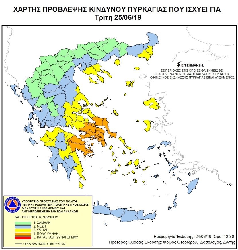 Σήμερα είναι η πρώτη μέρα κατά την αντιπυρική περίοδο του 2019 όπου η πρόβλεψη για δείκτη επικινδυνότητας εκδήλωσης πυρκαγιάς, σύμφωνα το χάρτη που έχει εκδώσει η Γενική Γραμματεία Πολιτικής Προστασίας, είναι κατηγορίας 4 (πολύ υψηλή).
