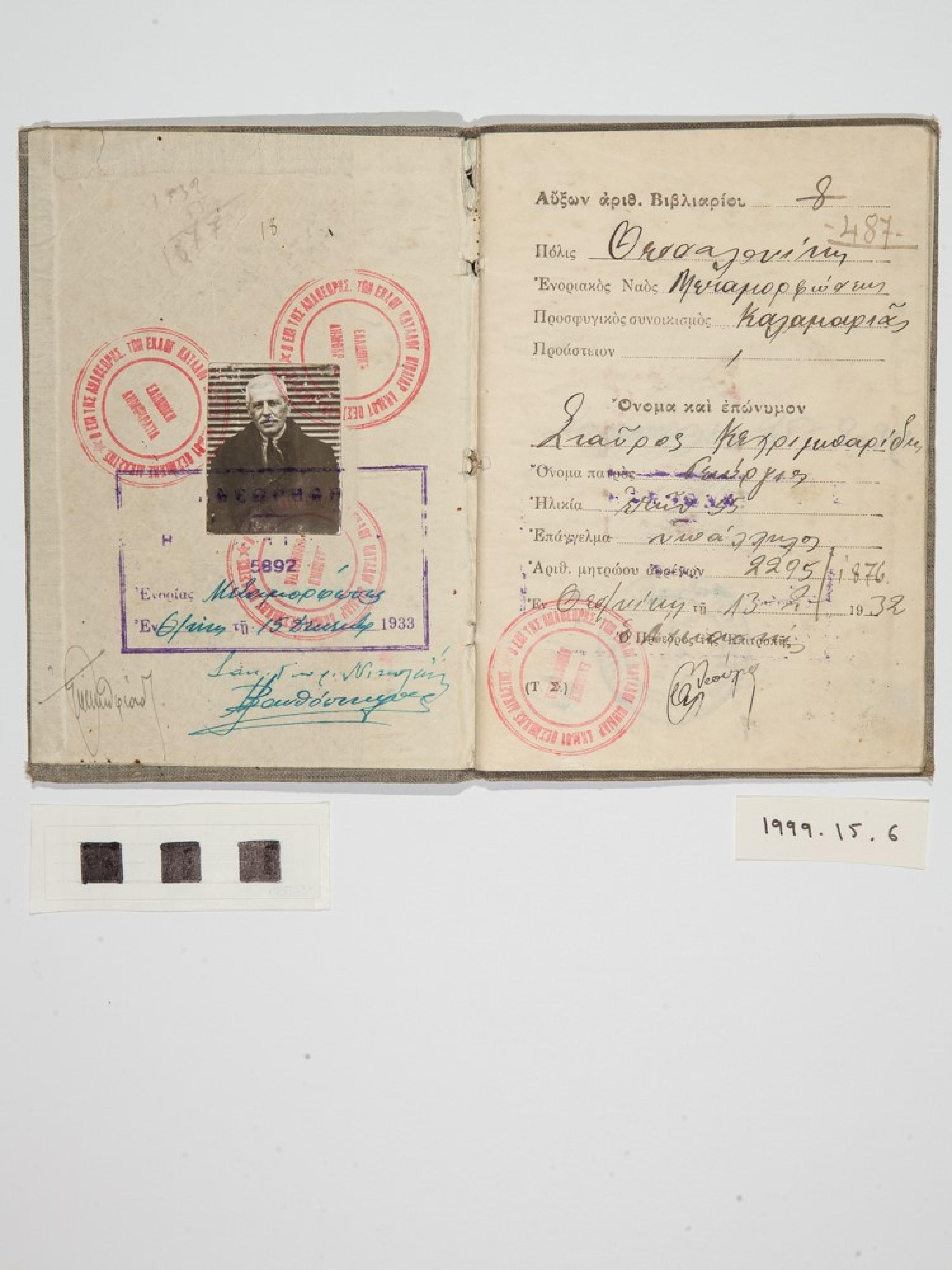 Το εκλογικό βιβλιάριο έχει ημερομηνία έκδοσης 13 Φεβρουαρίου 1932 (όταν ο κάτοχος ήταν 55 ετών), αλλά έχει και σφραγίδα με την ημερομηνία 15 Δεκεμβρίου 1933.