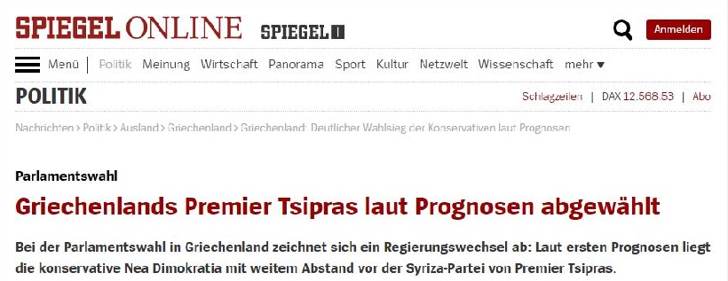 «Στις γενικές εκλογές στην Ελλάδα, έχουμε αλλαγή της κυβέρνησης» γράφει το Der Spiegel, τονίζοντας ότι, σύμφωνα με τις αρχικές προβλέψεις, το συντηρητικό κόμμα της Νέας Δημοκρατίας είναι πολύ πιο μπροστά από τον ΣΥΡΙΖΑ του πρωθυπουργού Αλέξη Τσίπρα.