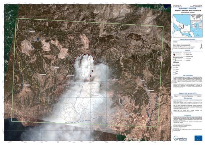Με εντολή του γγ Πολιτικής Προστασίας Νίκου Χαρδαλιά ενεργοποιήθηκε από τη Διεύθυνση Σχεδιασμού και Αντιμετώπισης Εκτάκτων Αναγκών της Γενικής Γραμματείας η Υπηρεσία Copernicus της Ευρωπαϊκής Ένωσης, με σκοπό τη χαρτογράφηση της έκτασης που καταστράφηκε και τις ζημιές που έχουν προκληθεί από τη μεγάλη πυρκαγιά στην Εύβοια. Σήμερα δόθηκε στη δημοσιότητα και η πρώτη φωτογραφία που ελήφθη πριν από την επέκταση της φωτιάς, η περίμετρος της οποίας ξεπέρασε τα 11,5 χιλιόμετρα αργά το απόγευμα της Τρίτης.