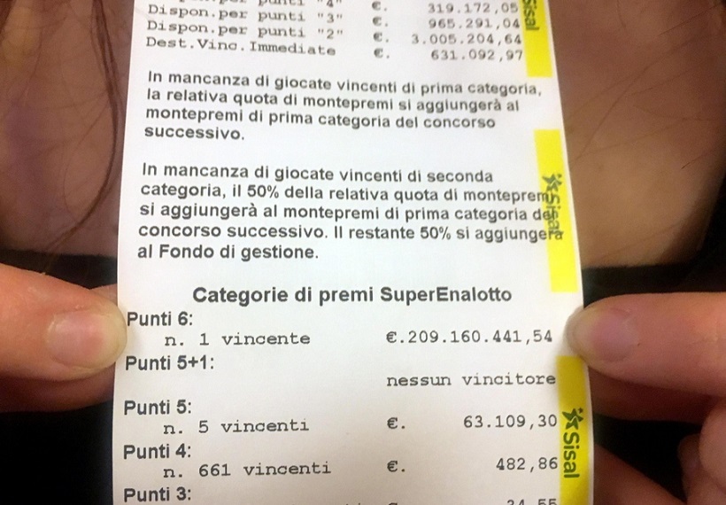 SuperEnalotto: Τυχερό δελτίο κέρδισε 209 εκατ. ευρώ στην Ιταλία (φωτο)