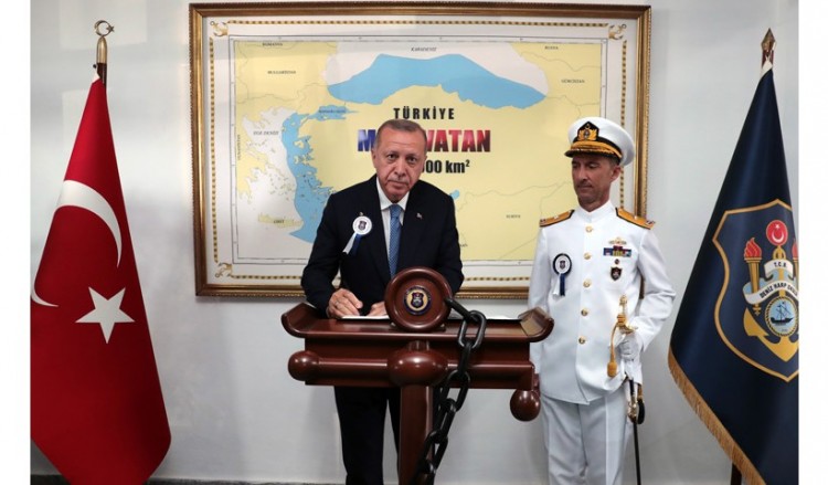 Φωτογραφία που δημοσιεύτηκε στην επίσημη ιστοσελίδα της Προεδρίας της Τουρκίας δείχνει τον πρόεδρο να υπογράφει το βιβλίο επισκεπτών στο Πανεπιστήμιο Εθνικής Άμυνας, ενώ στο φόντο υπάρχει μεγάλος κορνιζαρισμένος χάρτης στον οποίο αποτυπώνονται οι επιθυμίες τις Άγκυρας.