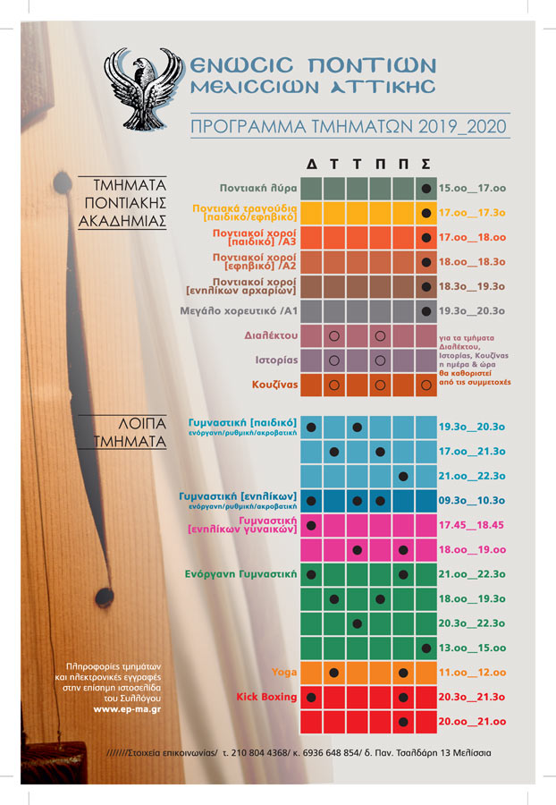 Μετά την απαραίτητη ανάπαυλα για τις καλοκαιρινές διακοπές, η Ένωση Ποντίων Μελισσίων Αττικής ετοιμάζεται δυναμικά για τη νέα πολιτιστική περίοδο 2019-2020.