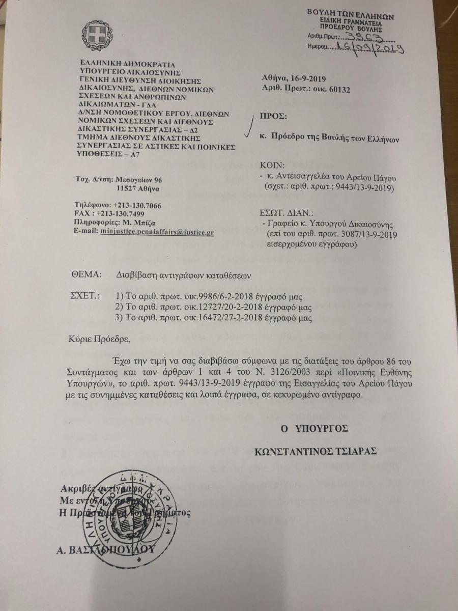 «Σας διαβιβάζουμε χωρίς αξιολόγηση, κατ’ εφαρμογή των διατάξεων των άρθρων 86 παρ.1 και 2 του Συντάγματος και των άρθρων 1 και 4 του Ν. 3126/2003 “Περί ποινικής ευθύνης υπουργών”, όπως ισχύει, καθώς και του άρθρου 153 του Κανονισμού της Βουλής (όπως ισχύει):
