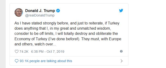 Ο Ντόναλντ Τραμπ απείλησε «να καταστρέψει ολοσχερώς και να εξολοθρεύσει» την τουρκική οικονομία στην περίπτωση που η Άγκυρα προβεί σε οποιαδήποτε ενέργεια που ο ίδιος, με την «ανυπέρβλητη σοφία» του, θεωρήσει είναι ότι «εκτός ορίων», έπειτα από την απόφασή του να δώσει διαταγή για την απόσυρση των αμερικανικών δυνάμεων από την βορειοανατολική Συρία.