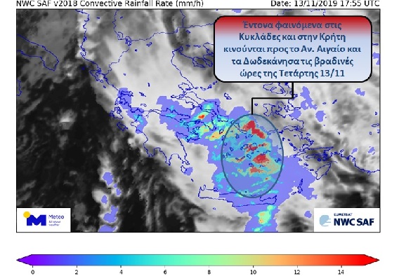 Τις αμέσως επόμενες ώρες θα επηρεαστούν τα νησιωτικά τμήματα του ανατολικού Αιγαίου και τα Δωδεκάνησα, όπου τα φαινόμενα αναμένεται να ενταθούν, ενώ εξασθένηση των φαινομένων και σταδιακή βελτίωση του καιρού στις συγκεκριμένες περιοχές περιμένουμε από το μεσημέρι της Πέμπτης (14/11).