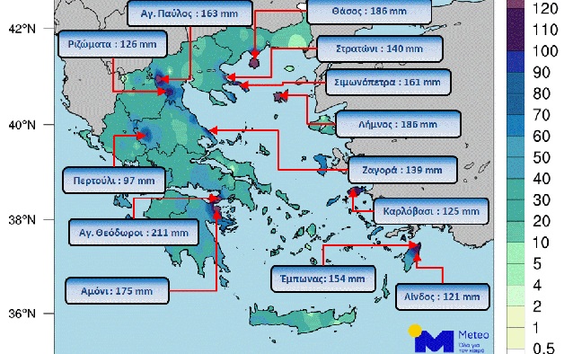 Στο σύνολό της η κακοκαιρία απέδωσε πολύ μεγάλα ύψη βροχής τόσο σε ηπειρωτικές όσο και σε νησιωτικές περιοχές της χώρας, επιβεβαιώνοντας τις προβλέψεις για γενικευμένη και έντονη κακοκαιρία.