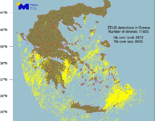 Συνολικά καταγράφηκαν 11.605 κεραυνοί με τους 2.972 να πέφτουν στη θάλασσα και τους 8.633 στην ξηρά.