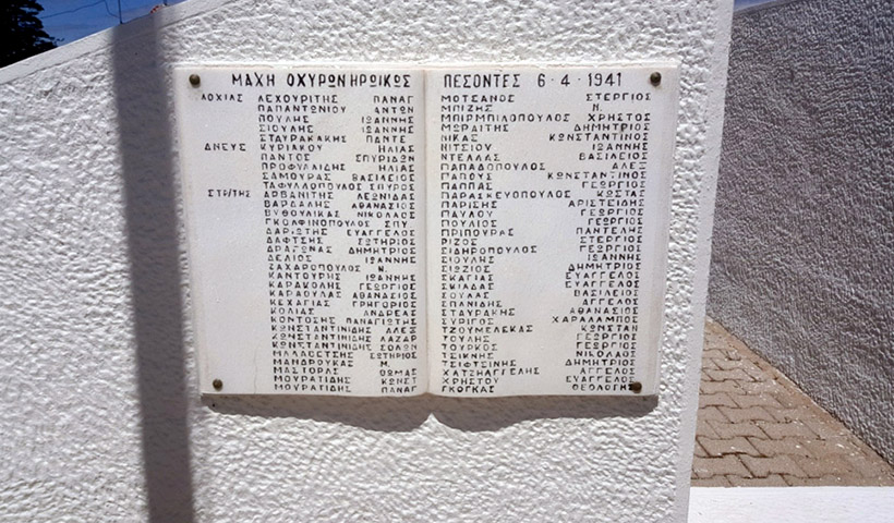 Τα ιστορικά λόγια του αντισυνταγματάρχη Δουράτσου «τα οχυρά δεν παραδίδονται αλλά καταλαμβάνονται», βρίσκονται στην είσοδο της στοάς αποδίδοντας το μέγεθος του ηρωισμού των Ελλήνων στρατιωτών. Είχαν προηγηθεί για μέρες σφοδροί βομβαρδισμοί από την πλευρά των Γερμανών, που όμως δεν είχαν κάμψει το ηθικό των υπερασπιστών των οχυρών.
