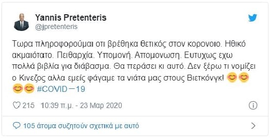 «Τώρα πληροφορούμαι ότι βρέθηκα θετικός στον κορονοϊό. Ηθικό ακμαιότατο. Πειθαρχία. Υπομονή. Απομόνωση. Ευτυχώς έχω πολλά βιβλία για διάβασμα. Θα περάσει κι αυτό. Δεν ξέρω τι νομίζει ο Κινέζος άλλα εμείς φάγαμε τα νιάτα μας στους Βιετκόνγκ!», έγραψε ο δημοσιογράφος.