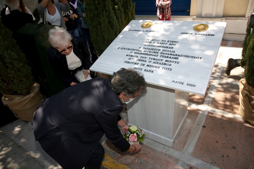Η πλακέτα που έχει τοποθετηθεί στο κτήριο-τάφο για τους τρεις ανθρώπους και το αγέννητο μωρό της Παπαθανασοπούλου, γράφει «Σε αυτό το κτήριο στις 5 Μαΐου 2010 δολοφονήθηκαν η Παρασκευή Ζούλια, η εγκυμονούσα Αγγελική Παπαθανασοπούλου, ο Επαμεινώνδας Τσάκαλης, θύματα του τυφλού μίσους που γεννά ο διχασμός. Τιμούμε τη μνήμη τους. Ποτέ ξανά. Μάιος 2020».