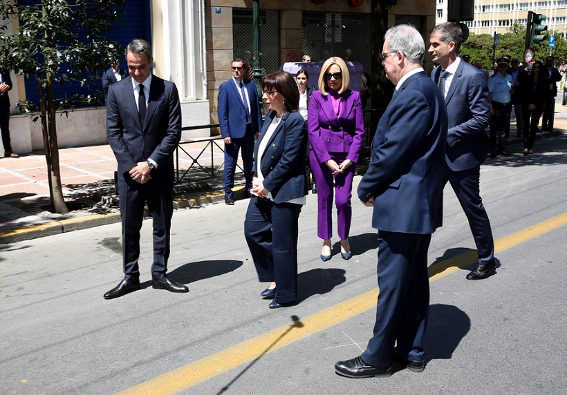 Μετά τα αποκαλυπτήρια η Πρόεδρος της Δημοκρατίας συνομίλησε με συγγενείς θυμάτων υπογραμμίζοντας πως αυτή η πλακέτα «είναι το ελάχιστο που οφείλουμε όλοι, είναι για τον τόπο σημαντικό. Να τους θυμάστε και πραγματικά να μη ζήσουμε τέτοιες στιγμές». Τον λόγο πήρε στη συνέχεια ο πρωθυπουργός. «Ο συμβολισμός της σημερινής κίνησης είναι σαφής και ξεκάθαρος. Ποτέ ξανά να μην πέσει η χώρα θύμα του τυφλού διχασμού, του μίσους, της βίας η οποία δεν μπορεί να δικαιολογηθεί ποτέ και από όπου κι αν προέρχεται», είπε. Ο Κυριάκος Μητσοτάκης αναφέρθηκε στο ό,τι θα έπρεπε σύσσωμος ο πολιτικός κόσμος να ήταν παρών στην τελετή «ώστε να στείλουμε ενωμένοι ένα μήνυμα ότι αυτές τις δύσκολες εποχές για τον τόπο μας, τις έχουμε αφήσει οριστικά πίσω μας, σχολιάζοντας στην ουσία το ότι τόσο ο Αλέξης Τσίπρας όσο και ο Δημήτρης Κουτσούμπας είχαν πάει στον χώρο νωρίτερα για να καταθέσουν στεφάνι, αρνούμενοι να παραστούν στη συγκεκριμένη τελετή.