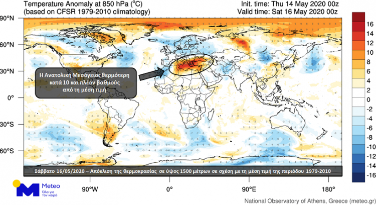 Εντυπωσιακό είναι πως η αναμενόμενη απόκλιση από τη μέση τιμή της θερμοκρασίας γι’ αυτήν την εποχή θα ξεπεράσει τους 10 βαθμούς Κελσίου και θα είναι η μεγαλύτερη που θα καταγραφεί σε όλον τον πλανήτη τις επόμενες ημέρες!