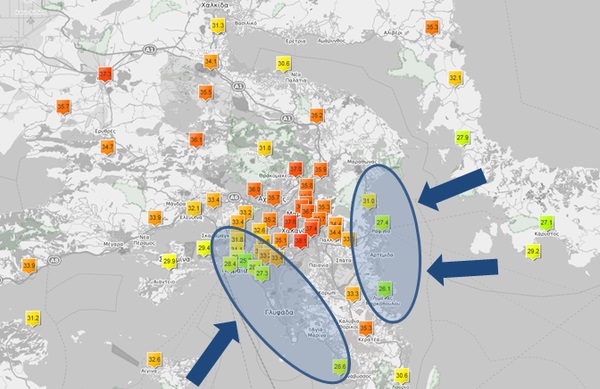 Στην Αττική οι θαλάσσιες αύρες που επικράτησαν τις θερμές ώρες της ημέρας κράτησαν σε χαμηλότερα επίπεδα τη θερμοκρασία στις παράκτιες περιοχές καθώς μετέφεραν προς αυτές ψυχρότερες αέριες μάζες από τη θάλασσα. Αντίθετα στο εσωτερικό του νομού οι μέγιστες θερμοκρασίες που καταγράφηκαν ήταν έως 10-12 βαθμούς υψηλότερες, με την απολύτως μέγιστη να σημειώνεται στο σταθμό Παπάγου (38.1 C). Στο χάρτη που ακολουθεί φαίνεται η μέγιστη θερμοκρασία που κατέγραψαν οι σταθμοί της Αττικής, η μέση διεύθυνση του ανέμου το μεσημέρι της Παρασκευής 15/05 στις παράκτιες περιοχές (γαλάζια βέλη) καθώς οι περιοχές όπου η θερμοκρασία παρέμεινε σε σχετικά χαμηλά επίπεδα (γαλάζιες ελλείψεις).