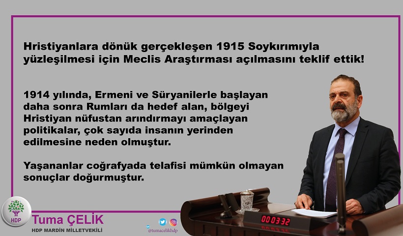 Όπως σημειώνει στην επερώτησή του ο Τσελίκ «Προτείναμε την διεξαγωγή κοινοβουλευτικής έρευνας για την αντιμετώπιση της γενοκτονίας που πραγματοποιήθηκε κατά των χριστιανών το 1915. Οι πολιτικές που άρχισαν το 1914 με στόχο τους Αρμένιους και τους Ασσύριους και αργότερα τους Έλληνες και είχαν ως στόχο την εκκαθάριση της περιοχής από τους χριστιανούς, έγιναν αιτία να εκτοπιστούν πολλοί άνθρωποι. Αυτά που συνέβησαν στην περιοχή, επέφεραν συνέπειες που δεν είναι δυνατόν να αντισταθμιστούν».