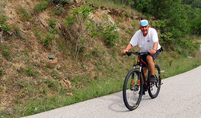 Ούτε οι στροφές ούτε οι ανηφόρες ούτε οι κατηφόρες πτοούν τον 75χρονο, που δεν μπορεί να φανταστεί ούτε μια μέρα της ζωής του χωρίς ποδήλατο, όπως λέει χαρακτηριστικά.