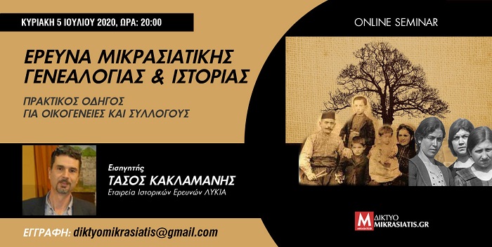 Τα μυστικά της έρευνας για την ιχνηλάτηση της μικρασιατικής γενεαλογίας και ιστορίας θα μοιραστεί ο Τάσος Κακλαμάνης από την Εταιρεία Ιστορικών Ερευνών «ΛΥΚΙΑ», στο 3ο ONLINE Σεμινάριο που διοργανώνει το Δίκτυο Μικρασιάτης, την Κυριακή 5 Ιουλίου, στις 20:00, με θέμα: Έρευνα Μικρασιατικής Γενεαλογίας και Ιστορίας – Πρακτικός Οδηγός για Οικογένειες και Συλλόγους.