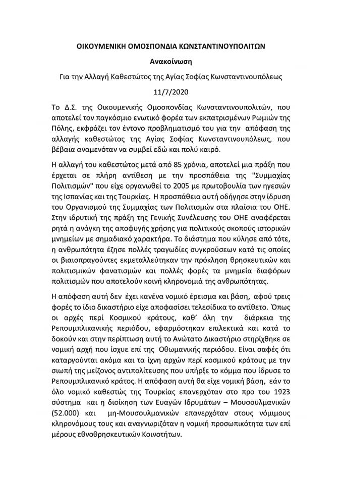 Τον έντονο προβληματισμό της για την μετατροπή της Αγίας Σοφίας σε τζαμί εξέφρασε η Οικουμενική Ομοσπονδία Κωνσταντινουπολιτών (ΟΙΟΜΚΩ), με δεδομένο ότι η απόφαση δεν έχει κανένα νομικό έρεισμα και βάση.