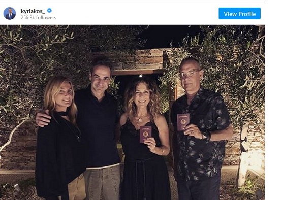 «Ο Τομ Χανκς και η Ρίτα Γουίλσον είναι πλέον υπερήφανοι Έλληνες πολίτες», είναι το σχόλιο (στα αγγλικά) που συνοδεύει τη φωτογραφία που ανέβασε ο πρωθυπουργός στον λογαριασμό του στο Instagram.