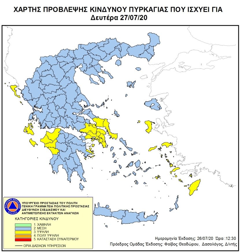 Υψηλός κίνδυνος πυρκαγιάς (κατηγορία κινδύνου 3) σε Αττική, Βοιωτία, Εύβοια, Αχαΐα, Ηλεία, νησιά Ιονίου, Σάμο, Χίο, Ικαρία και Δωδεκάνησα προβλέπεται τη Δευτέρα, σύμφωνα με το Χάρτη Πρόβλεψης Κινδύνου Πυρκαγιάς (δείτε ΕΔΩ) που εκδίδει η Γενική Γραμματεία Πολιτικής Προστασίας.