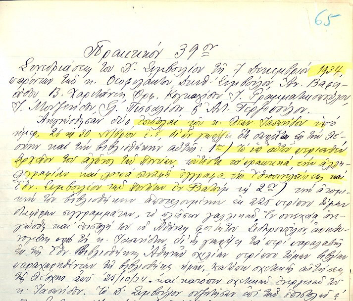 Απόσπασμα πρακτικού αρ. 39, συνεδρίασης του ΔΣ της Ευξείνου Λέσχης, της 7ης Δεκεμβρίου 1934