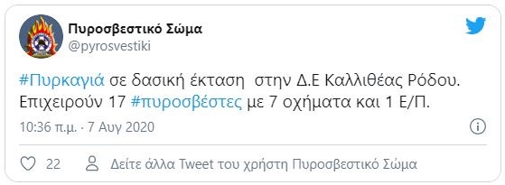 Στο σημείο για την κατάσβεση της πυρκαγιάς επιχειρούν 17 πυροσβέστες με επτά οχήματα, ενώ από αέρος συνδράμει ένα ελικόπτερο.