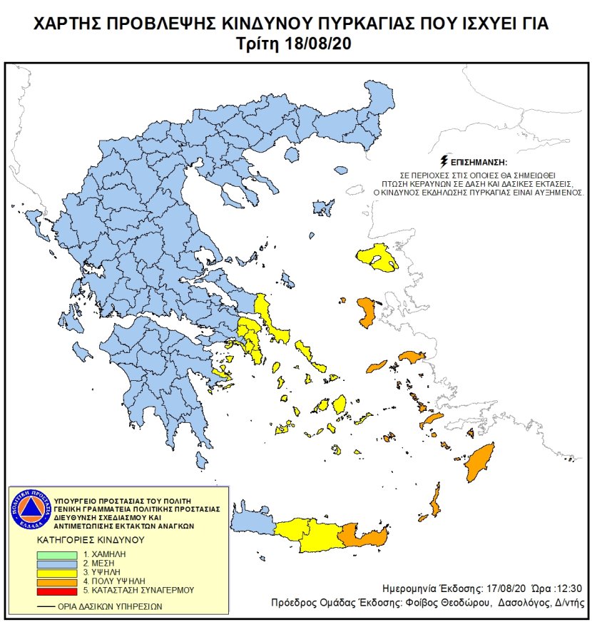 Πιο συγκεκριμένα, η Γενική Γραμματεία Πολιτικής Προστασίας προβλέπει για την Τρίτη πολύ υψηλό κίνδυνο πυρκαγιάς (κατηγορία κινδύνου 4) για τις Περιφέρειες Βόρειου Αιγαίου (Περιφερειακές Ενότητες: Χίου, Σάμου και Ικαρίας), Νοτίου Αιγαίου (Περιφερειακές Ενότητες: Καλύμνου, Κω, Καρπάθου και Ρόδου – πλην Καστελόριζου) και Κρήτης (Περιφερειακή Ενότητα Λασιθίου).