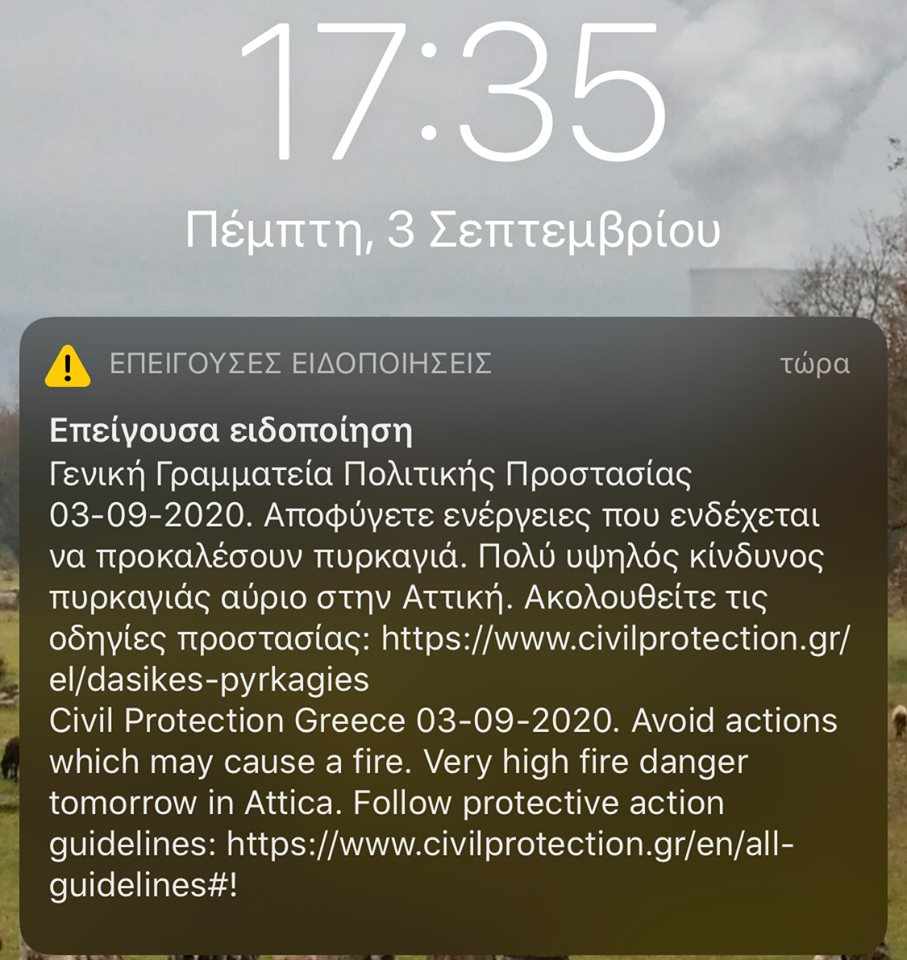 Στο μήνυμα τονίζεται ότι θα πρέπει να ακολουθήσουν τις οδηγίες προστασίας, παραπέμποντας σε σχετικό σύνδεσμο στην ιστοσελίδα της Γενικής Γραμματείας Πολιτικής Προστασίας.
