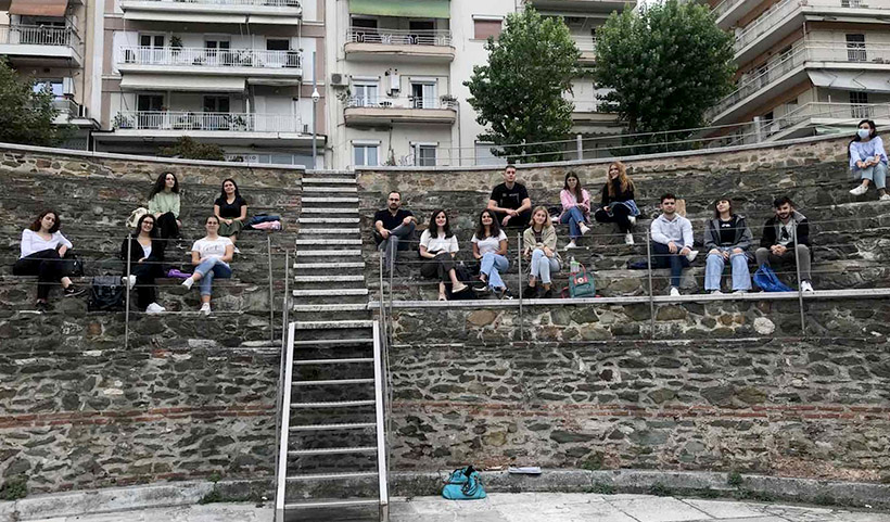 Η διδάσκουσα του Τμήματος και συγγραφέας Σοφία Νικολαΐδου σκεφτόταν, από το καλοκαίρι ακόμη, πώς να υποδεχτεί τους φοιτητές σε αυτήν τη δύσκολη κατάσταση. «Ήθελα να δω τα πρόσωπά τους, και με τη μάσκα αυτό δεν γίνεται», εξηγεί. Φρόντισε από νωρίς και πήρε την απαιτούμενη άδεια από την Εφορεία Αρχαιοτήτων Πόλης Θεσσαλονίκης για να πραγματοποιηθεί το μάθημα στην Αρχαία Αγορά, ενημέρωσε διαδικτυακά τους φοιτητές και τις φοιτήτριες για τη μορφή που θα έχει αυτό, και τελικά έδωσε στα παιδιά πολύ παραπάνω απ’ ό,τι ένα κλασικό μάθημα στις αίθουσες του τμήματος ή διαδικτυακά.