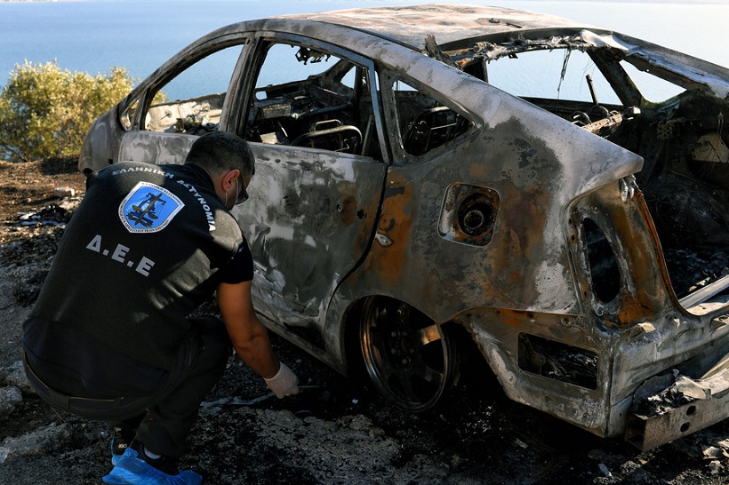 Αστυνομικός ερευνά καμένο αυτοκίνητο που βρέθηκε στο Λουτράκι και συνδέεται με την 45χρονη αλλοδαπή (φωτ.: ΑΠΕ-ΜΠΕ / Βασίλης Ψωμάς)