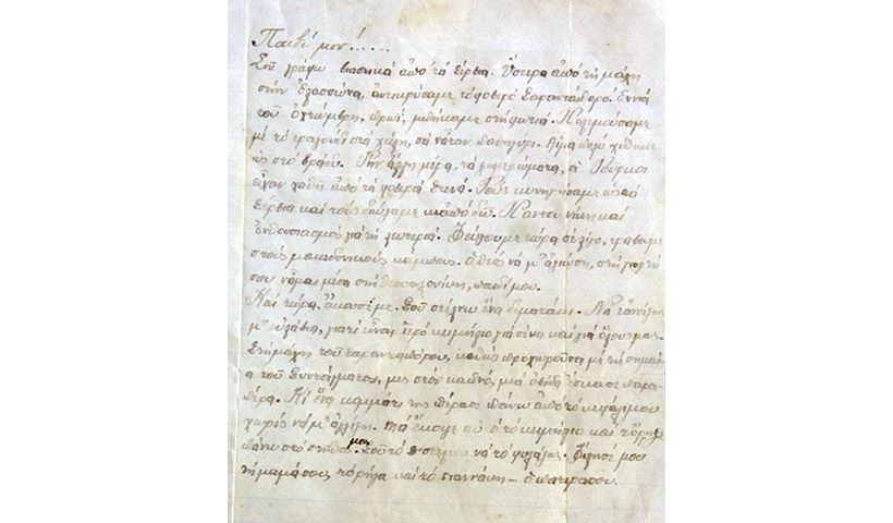 «Παιδί μου!… Σου γράφω βιαστικά από τα Σέρβια. Ύστερα από τη μάχη στην Ελασσώνα, αντικρύσαμε το φοβερό Σαραντάπορο. Εννιά του Οχτώβρη, πρωί, μπήκαμε στη φωτιά. Πολεμούσαμε με το τραγούδι στα χείλη, σα να ’ταν πανηγύρι. Αίμα πολύ χύθηκε ως το βράδυ. Την άλλη μέρα, τα ξημερώματα, οι Τούρκοι είχαν χαθεί από τα φοβερά Στενά. Παντού νίκη και ενθουσιασμός για τη λευτεριά. Ο Θεός να μ’ αξιώσει στη γιορτή σου να ’μαι μέσα στη Θεσσαλονίκη, παιδί μου», γράφει.