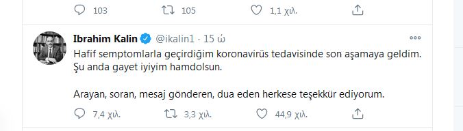 Ο Ιμπραχίμ Καλίν, εκπρόσωπος και στενός συνεργάτης του προέδρου της Τουρκίας Ρετζέπ Ταγίπ Ερντογάν, ενημέρωσε ότι έχει προσβληθεί από τον SARS-CoV-2. «Βρίσκομαι στο τελικό στάδιο της θεραπείας μου για τον κορονοϊό», ανέφερε ο Καλίν μέσω Twitter, προσθέτοντας ότι παρουσίασε μόνο «ήπια συμπτώματα» και διαβεβαιώνοντας πως «είμαι αρκετά καλά αυτή τη στιγμή, δόξα τω Θεώ».