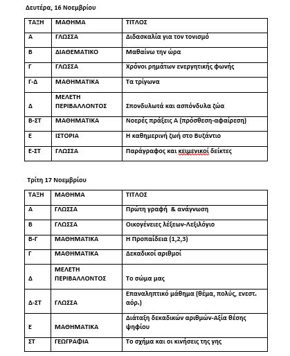 • Εκπαιδευτική τηλεόραση: Από τη Δευτέρα το πρωί στις 9 π.μ. (πρώτη ημέρα εφαρμογής των μέτρων) θα αρχίσουν να προβάλλονται από την ΕΡΤ2 τηλεοπτικά μαθήματα για μαθητές δημοτικού. Το πρόγραμμα για την Δευτέρα και την Τρίτη είναι το παρακάτω: